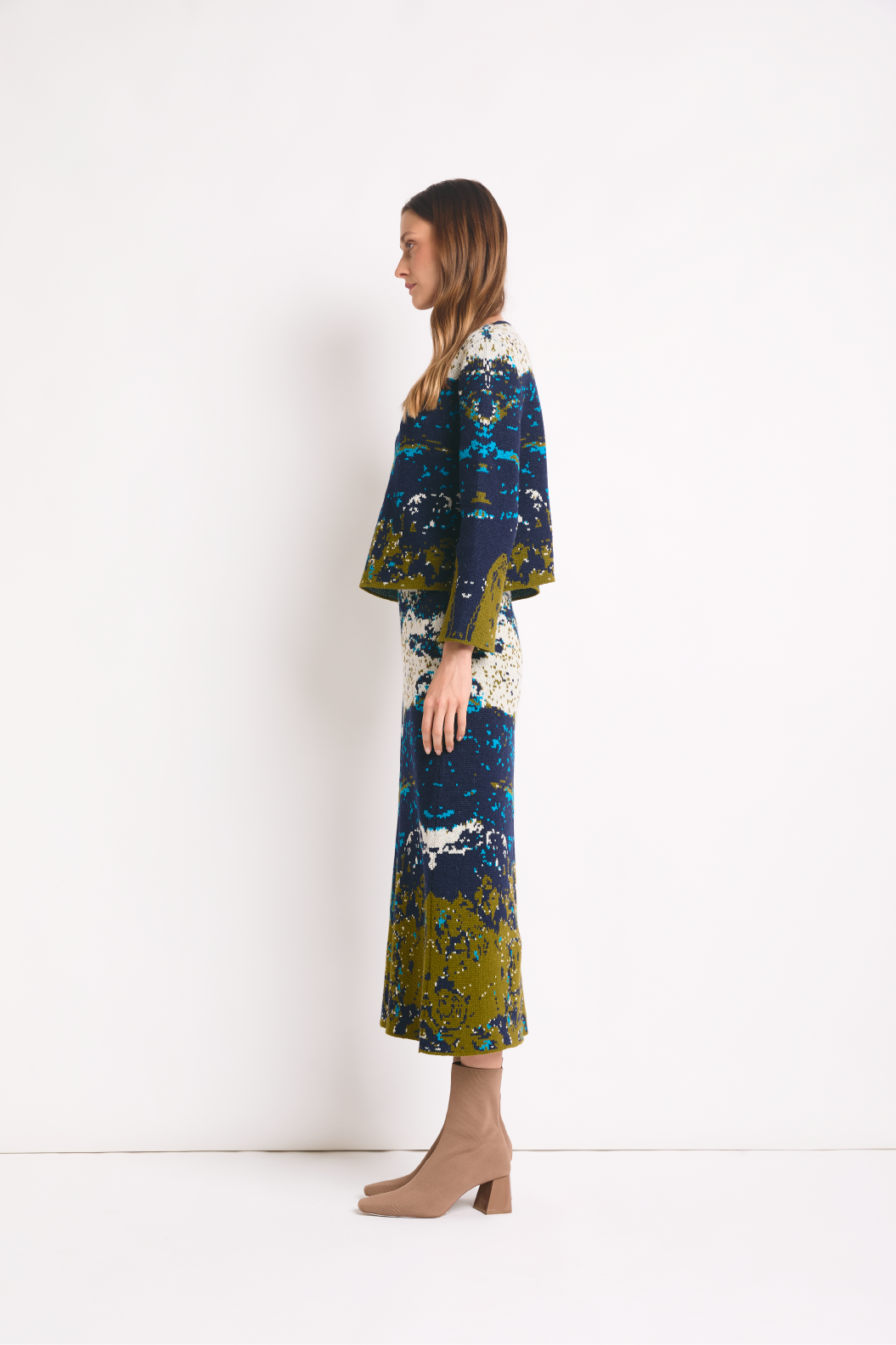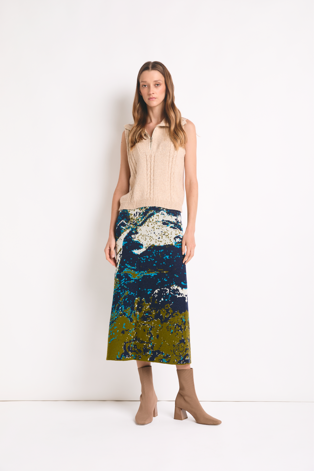 Falda ligera de lujo tejida con hilados 100% naturales de baby alpaca y algodón Pima. Utilizamos la técnica de jacquard permitiendo la producción de patrones complejos integrados directamente en la estructura misma del tejido.