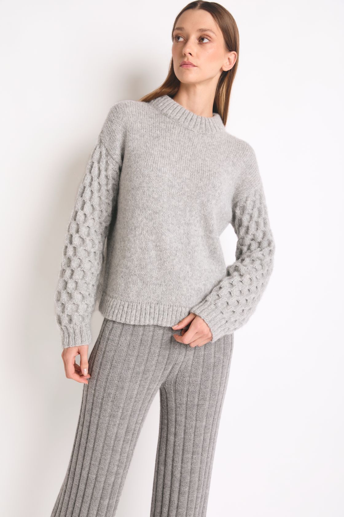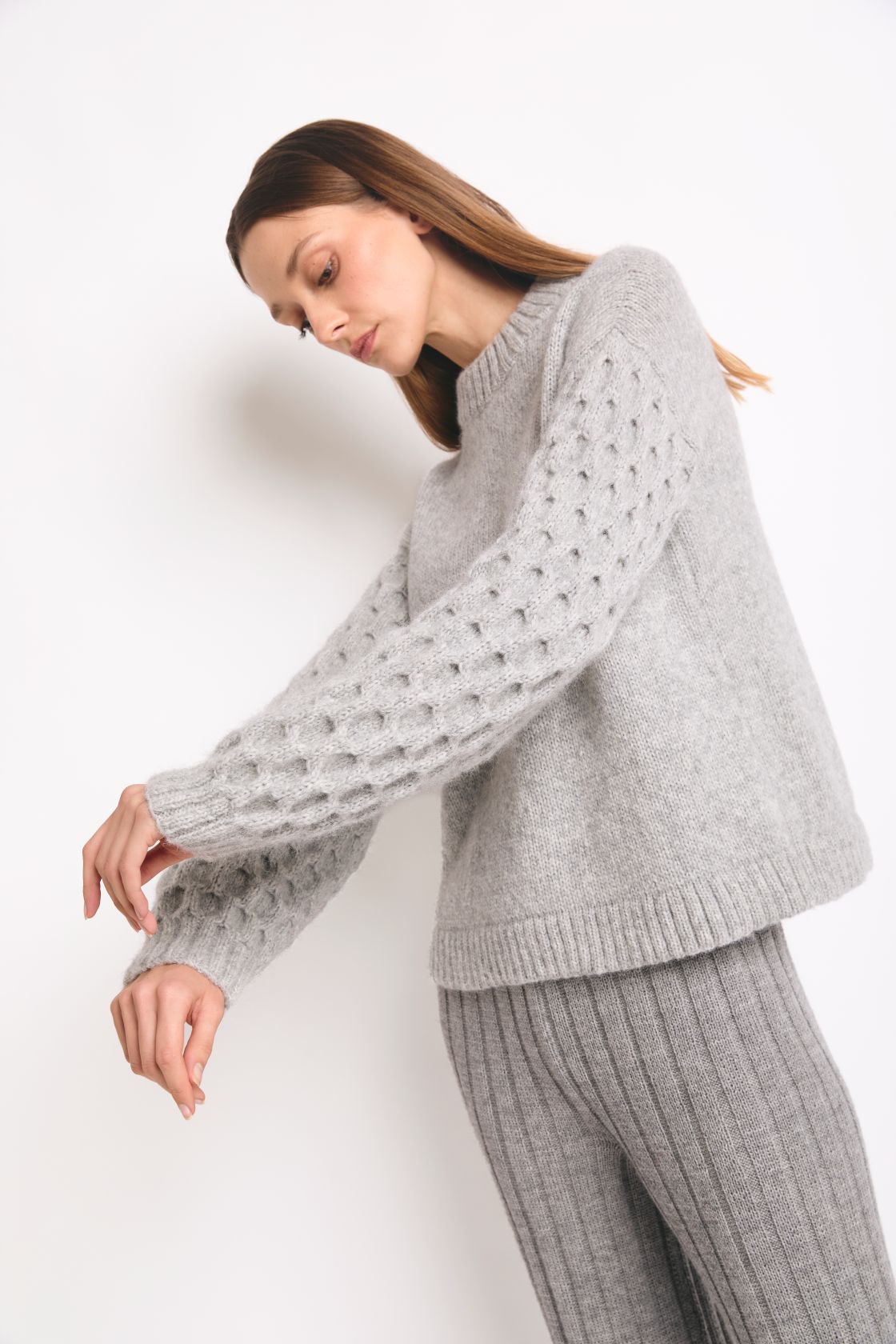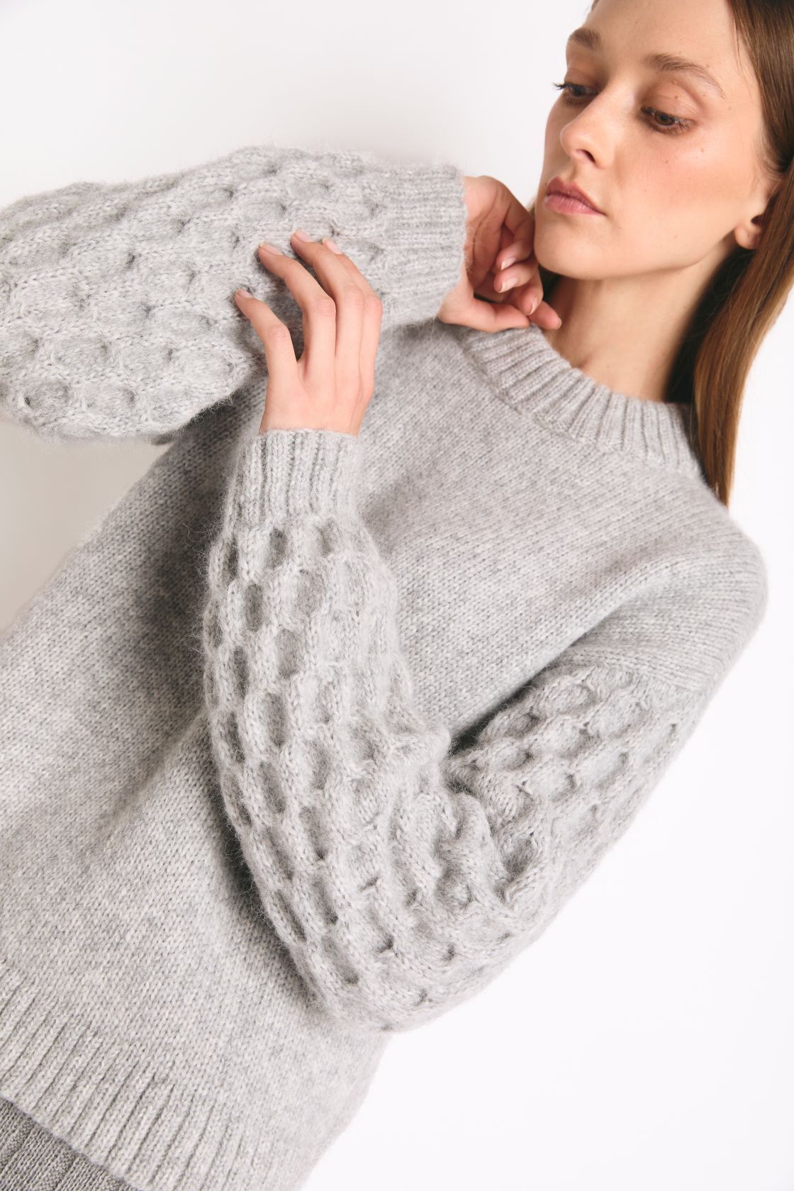 A sweater with beautiful sleeves! The sleeves are hand-knitted, while the body is manual machine-knitted. It is crafted from a luxurious blend of baby Alpaca and Merino wool.
